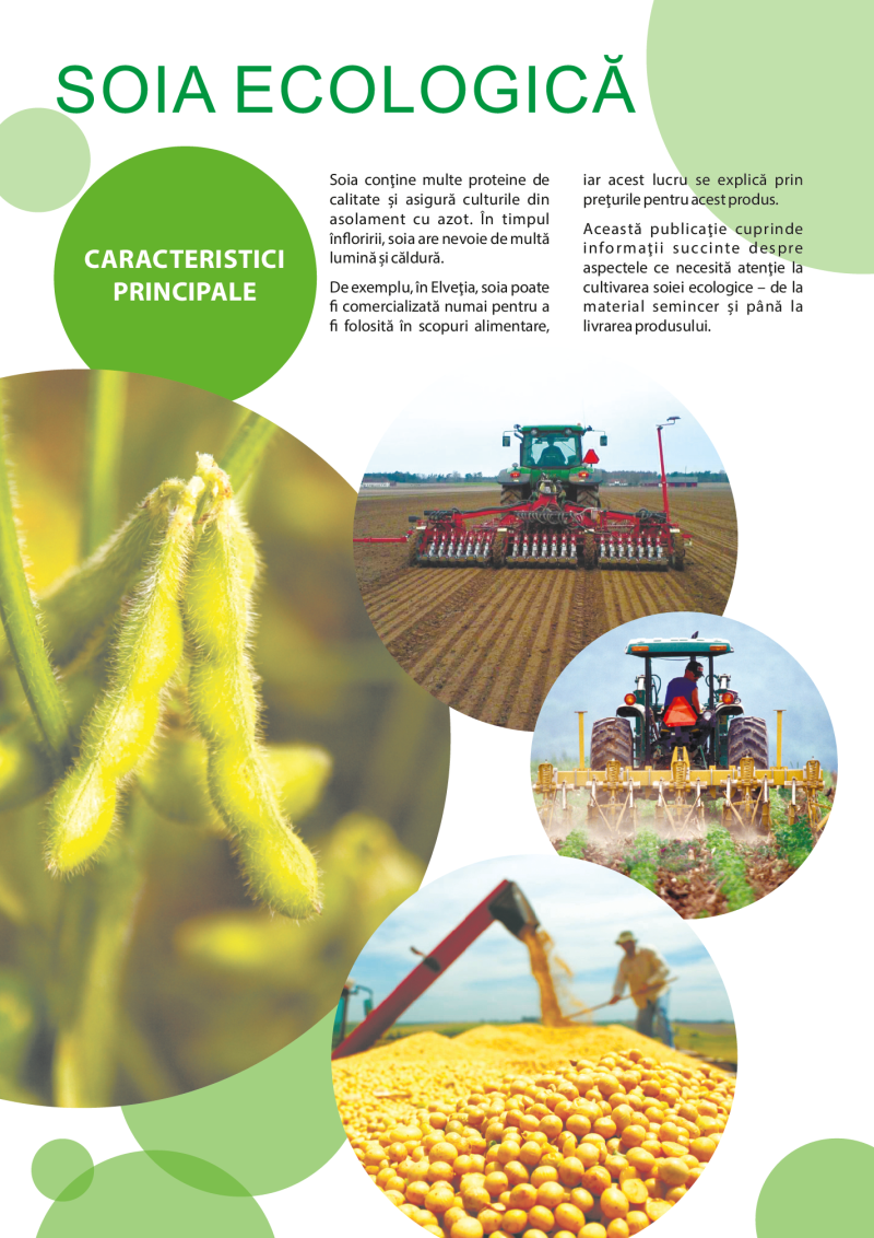 Această publicație descrie aspectele principale de cultivare a soiei ecologice, inclusiv caracteristicile generale, alegerea soiurilor, cerinţele faţă de soluri și climă, asigurarea cu substanţe nutritive, semănatul și controlul buruienilor și dăunătorilor, cele mai răspândite boli și recoltarea.